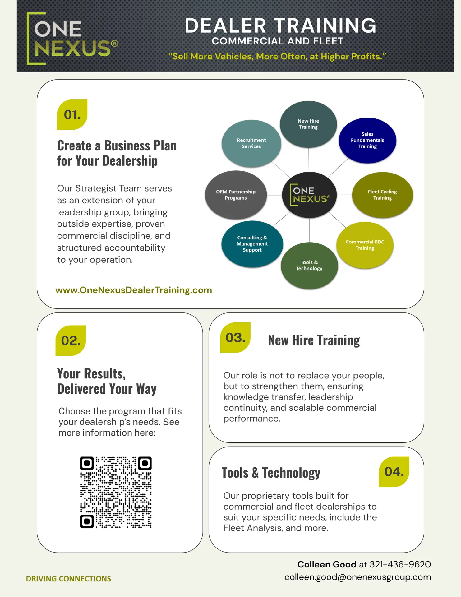 Through a blend of expert-led coaching, on-demand E-Learning, and real-world strategies, we help commercial teams increase vehicle sales, boost profitability, and build stronger, longer-lasting customer relationships.